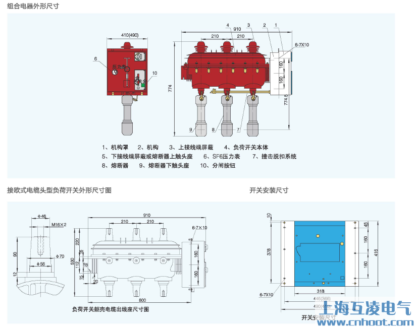 負(fù)荷開(kāi)關(guān)和組合電器由相同的絕緣軀殼開(kāi)關(guān)本體、相同的彈簧操動(dòng)機(jī)構(gòu)、熔斷器觸頭座和熔斷器動(dòng)作撞擊脫扣系統(tǒng)組成。裝可觸摸型電纜前接頭負(fù)荷開(kāi)關(guān)由專用的絕緣軀殼開(kāi)關(guān)本體、通用的彈簧操動(dòng)機(jī)構(gòu)組成。