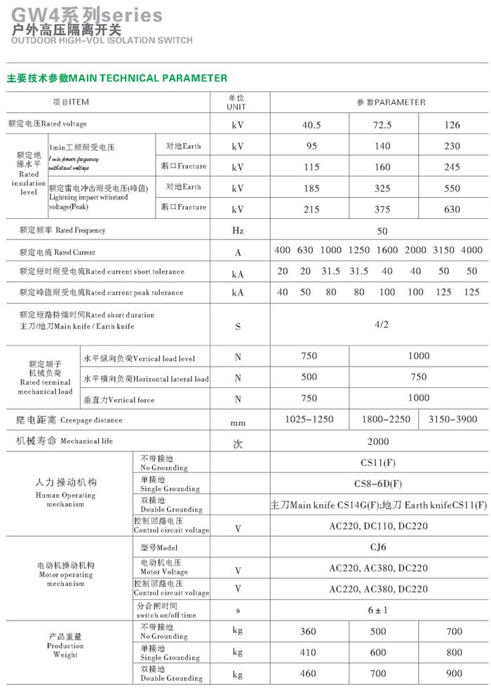 GW4-72.5kV銅管型隔離開關配用CS11-1型手力操作機構,GW4-72.5D型配用CS8-6D手力操作機構。