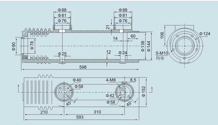 VS1-24絕緣筒適用于電流630~1250A的戶內(nèi)高壓真空斷路器中。其頂部和中部分別裝有出線臂,上出線臂通過上支架與滅弧室靜端固定聯(lián)結(jié),下出線臂通過下支架、軟連接與真空滅弧室動端導(dǎo)電桿聯(lián)結(jié),絕緣筒頂部內(nèi)外為四方結(jié)構(gòu),下部內(nèi)外為圓周結(jié)構(gòu),絕緣筒內(nèi)外均設(shè)有裙邊結(jié)構(gòu),其內(nèi)裙邊為整圈圓周結(jié)構(gòu),上、下支架直接固定于絕緣筒內(nèi)部。優(yōu)點(diǎn):安裝方便,斷路器各相間一致性好;導(dǎo)出線臂與滅弧室接成整體;能獲得象煙囪般的對流散熱效果;防止異物和灰塵進(jìn)入,滿足對爬距的要求。
